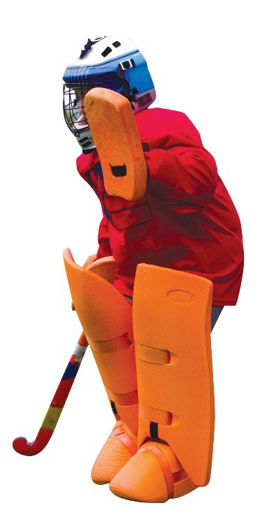 | Goalkeeper The goalkeeper wears an additional helmet, body guards, foot protectors, leg guards, handguards, and arm guards to protect himself/herself from the impact of shots. |