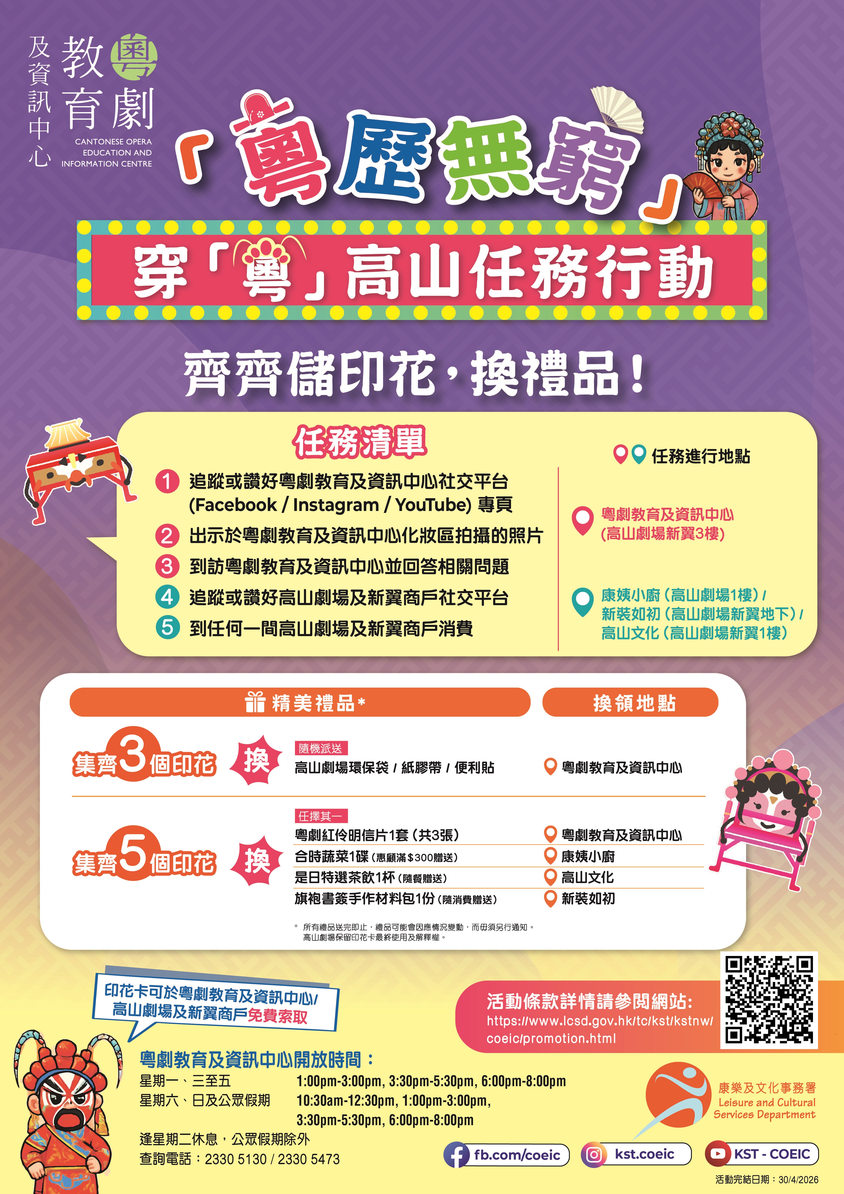 | 1. 追踪或赞好粤剧教育及资讯中心社交平台(Facebook / Instagram / YouTube)专页 | 粤剧教育及资讯中心(高山剧场新翼3楼) |